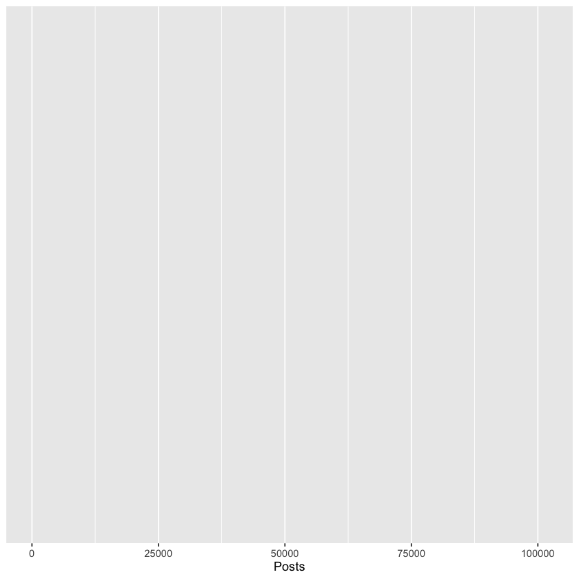 We will be plotting with ggplot(), which is all about building a plot up based on layers. We know we want to make a plot of Posts based on the insta data set. This line of code initiates a layer which acts as a “blank canvas” for us to plot over.