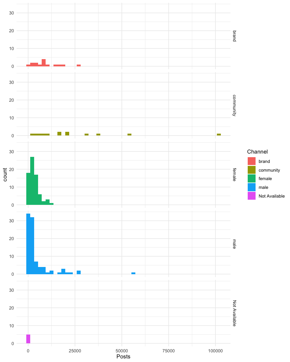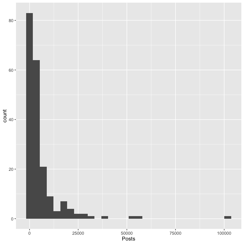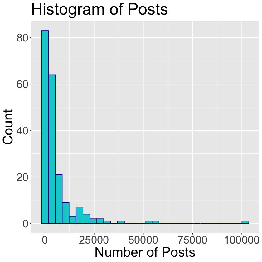 labs(x='Number of Posts', y='Count', title='Histogram of Posts') # rename axes and add title