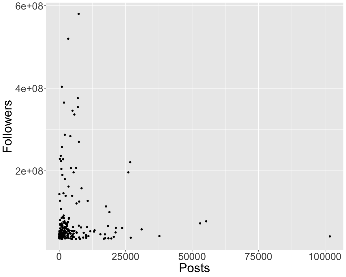 ggplot(insta, aes(x = Posts, y = Followers)) +