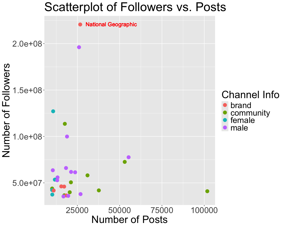 labs(x='Number of Posts', y='Number of Followers', color='Channel Info', title='Scatterplot of Followers vs. Posts') # rename axes and add title