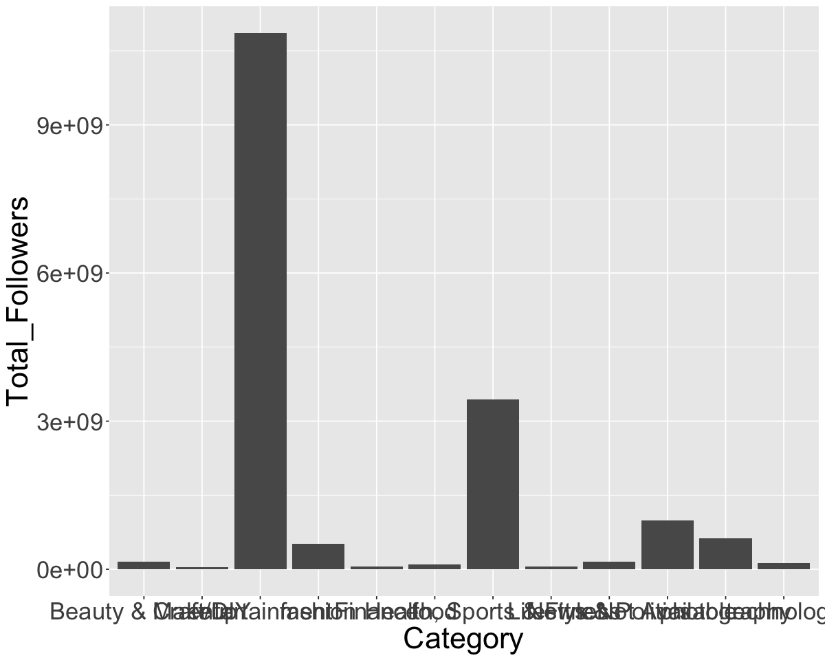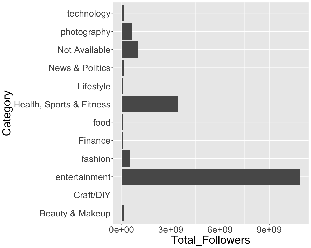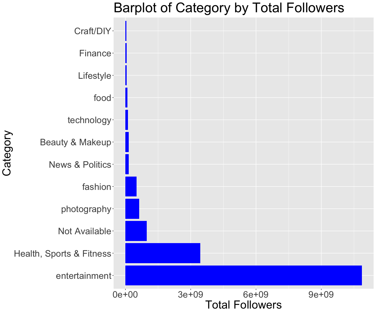 labs(x = "Total Followers", y ="Category", title = "Barplot of Category by Total Followers ") # change labels and title