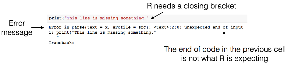 There’s a lot of terminology in programming languages, but you don’t need to know it all in order to program effectively. Even though the error message can seem cryptic, if you read it carefully you’ll often find hints as to what went wrong. For example, above, you’ll see the message unexpected end of input (among a lot of other technical jargon). In other words, R reached the end of the line of code, and wasn’t expecting to reach the end – it thinks there is still something missing!
