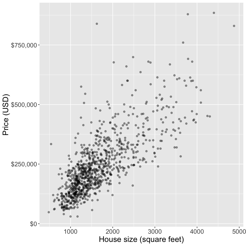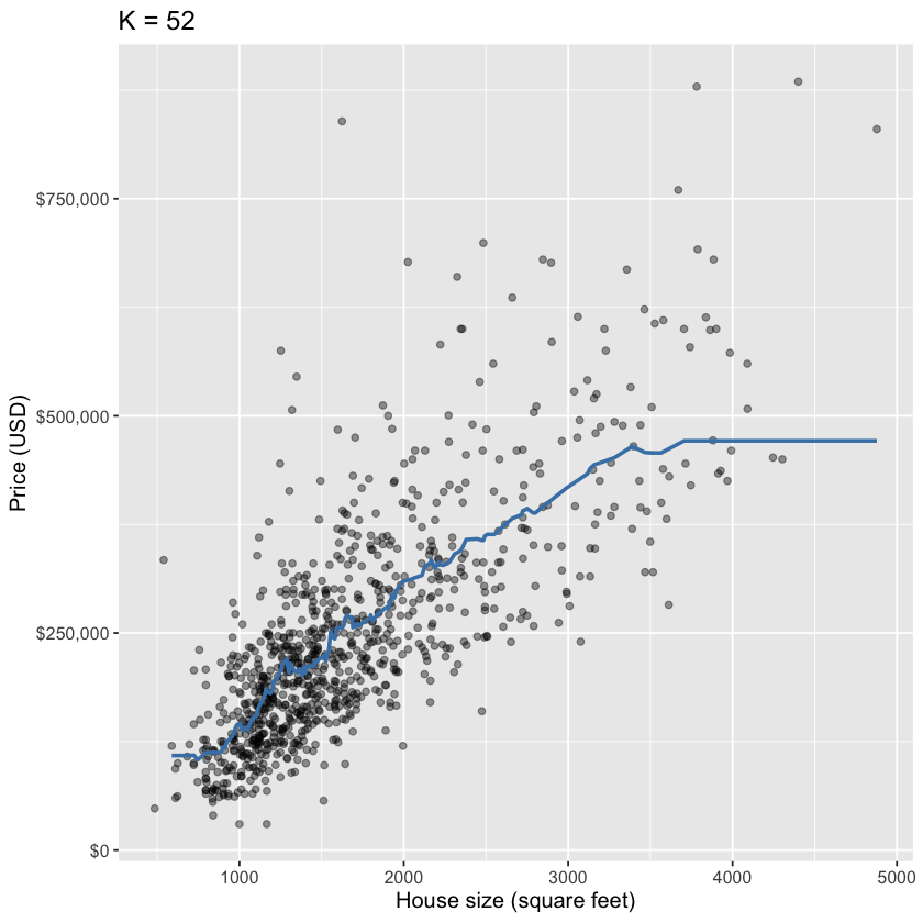 # Split the dataset.seed(123)housing_split <-initial_split(housing, prop =0.75, strata = price)housing_train <-training(housing_split)housing_test <-testing(housing_split)# Standardize the training datahousing_recipe <-recipe(price ~ sqft, data = housing_train) |>step_scale(all_predictors()) |>step_center(all_predictors())# Specify the regression model housing_model <-nearest_neighbor(weight_func ="rectangular",neighbors =tune()) |>set_engine("kknn") |>set_mode("regression") # Note we change this to regression instead of classification# Set the folds for cross validationhousing_vfold <-vfold_cv(housing_train, v =5, strata = price)# Define our workflow housing_wkflw <-workflow() |>add_recipe(housing_recipe) |>add_model(housing_model)housing_wkflw